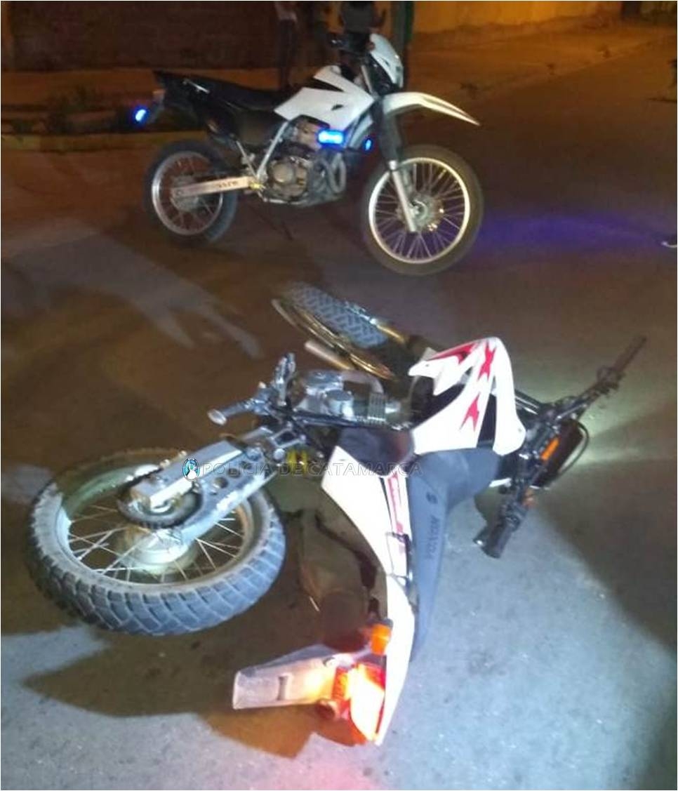 Se inició una persecución, a la que se unió personal del Grupo de Acción Operativa (GAO), y luego de circular por varias arterias, en algunas de ellas en sentido contrario al tránsito, en la esquina de la calle Fidel Castro y Pasaje José Luis de Cabrera, por causas que se tratan de establecer, el motociclista chocó contra la unidad móvil del GAO, lo que provocó que cayera a la cinta asfáltica, dejando abandonado en lugar el rodado, que quedó en calidad de secuestro, continuando la huida a pie, siendo finalmente interceptado en un arroyo paralelo a Avenida Los Inmigrantes, donde los policías aprehendieron a un joven de apellido Cobacho (22).
