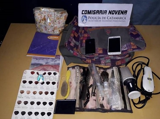 De inmediato y con las características brindadas, los Policías realizaron amplios recorridos por la zona y, en inmediaciones al lugar, procedieron a la aprehensión de un joven de apellido Bazán (26), quien sería el presunto autor del hecho y lograron recuperar un bolso que contenía una máquina de cortar el cabello, un cepillo para el cabello, un muestrario de tinturas, dos cuadernos, un bolso infantil y varios elementos de peluquería. Al momento de realizarle la requisa correspondiente, los Policías encontraron entre sus prendas de vestir dos teléfonos celulares; uno marca Samsung J-5 blanco y el restante un Iphone 4, de color negro, que quedaron en calidad de secuestro.