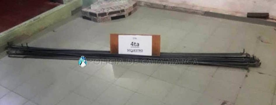 Hora más tarde, a las 4.20, alertado por un llamado telefónico, el personal interviniente se constituyó en la esquina de las calles Ancasti y Belén, donde una joven mujer de 19 años, hizo entrega voluntaria de 27 varillas de hierro N° 8, que estarían relacionadas con el hecho.