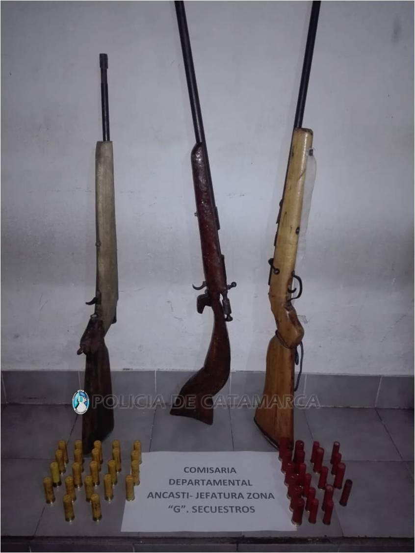En dichos inmuebles, y bajo las directivas de la Fiscalía de Instrucción en turno, los policías procedieron al secuestro de una escopeta de caza, con culata de madera artesanal y seis cartuchos calibre 28, dos rifles calibre 22, y 35 cartuchos PG para escopetas de diferentes calibres.