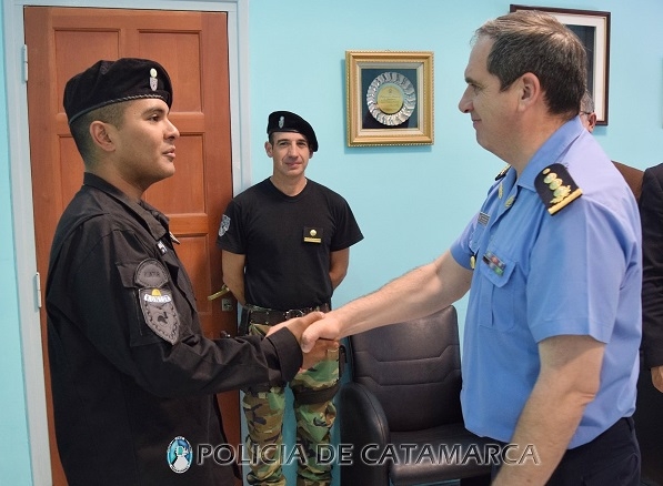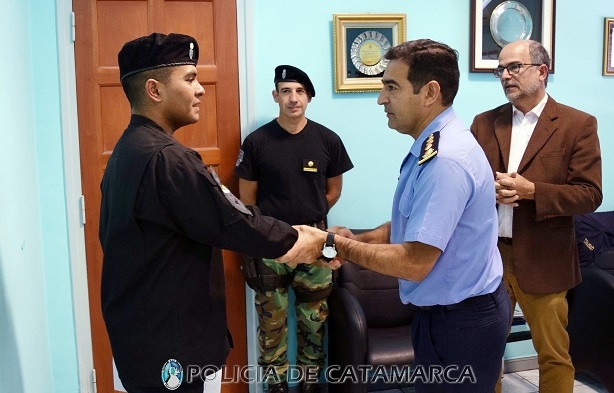 El secretario de Seguridad Marcos Denett, junto al Jefe de Policía, Orlando Antonio Quevedo; el Subjefe de Policía, Carlos Alfredo Kunz; y el Jefe de la División de Operaciones Especiales Kuntur, Marcos Herrera, hicieron entrega de una Resolución donde reconocen y felicitan al Cabo de Policía Delfor David Abarracin, por su oportuna intervención para salvaguardar la vida de una mujer que estaba siendo víctima de un violento arrebato en la zona norte de la Capital.
