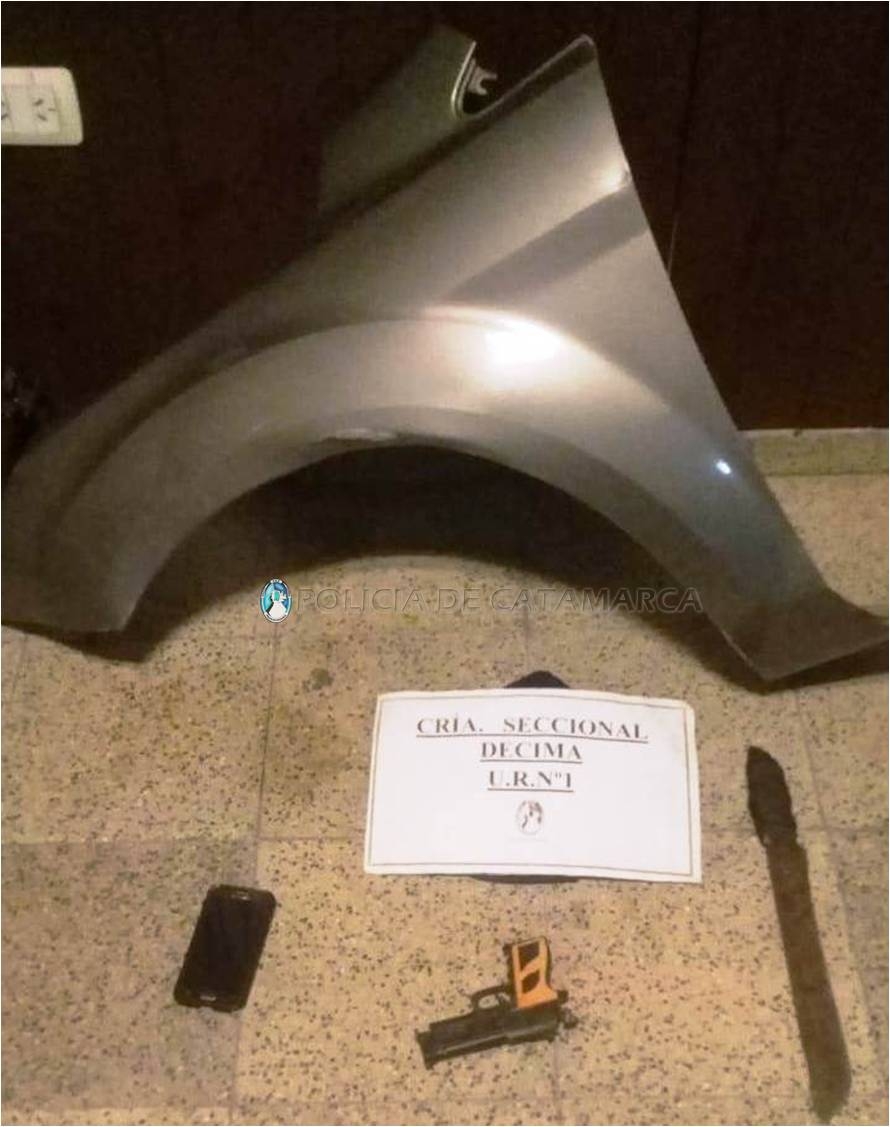 En el lugar, observaron a un sujeto que al percatarse de la presencia policial, dejó abandonado en el lugar un guardabarros de automóvil y un teléfono celular Samsung, de color negro, que quedaron en calidad de secuestro, para luego darse a la fuga.