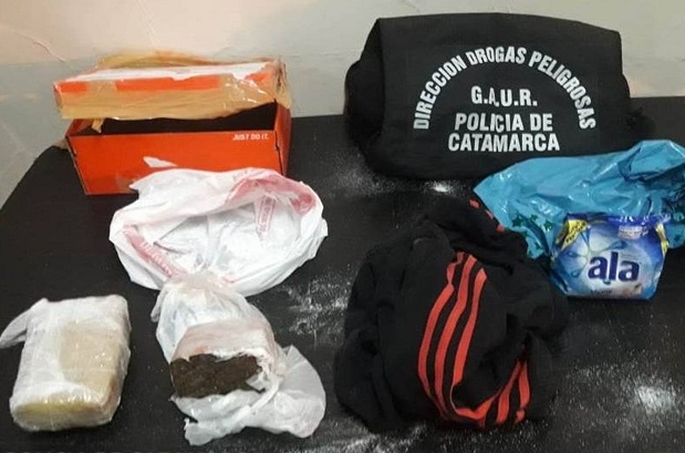 Ayer, a las 23:40, fruto de una investigación de hace varios meses, efectivos de la Dirección Drogas Peligrosas, conjuntamente con sus pares de los Grupos Antinarcóticos de Unidades Regionales (GAUR) de Tinogasta, Belén y Santa María, y de la Comisaría de Tinogasta, llegaron hasta la Terminal de Ómnibus de esa Ciudad, donde interceptaron a un adolescente de 16 años quien llevaba una encomienda que previamente habría retirado luego de arribar en un colectivo de media distancia.