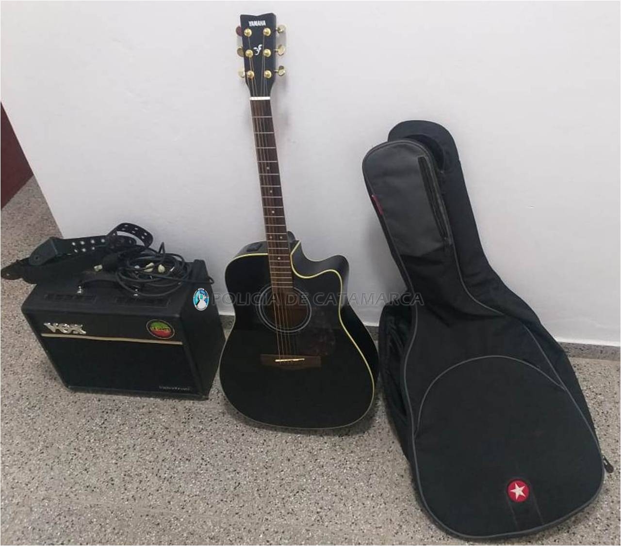 En el lugar, se entrevistaron con un hombre de 46 años, quien hizo entrega voluntaria de una guitarra de color negro, un amplificador de sonido con su respectiva correa y un prolongador de corriente, que quedaron en calidad de secuestro hasta determinar su legítima propiedad y procedencia.