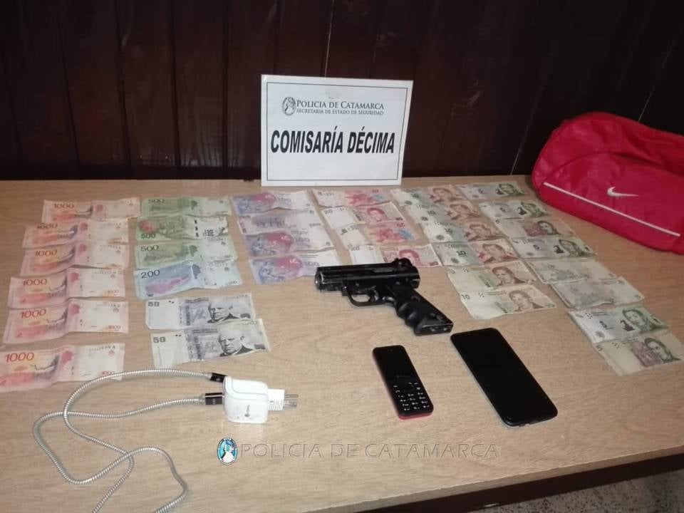 Al momento de realizarle la requisa correspondiente, los policías encontraron en un bolso de color rojo, el elemento en cuestión, que quedó en calidad de secuestro, al igual que prendas de vestir varias, 8380 pesos en efectivo, discriminados en billetes de distinta denominación, dos teléfonos celulares marca Bitell y Samsung J-7, color negro, un cargador de teléfonos celulares, y cuatro envoltorios que en su interior contenían una sustancia tipo herbácea.