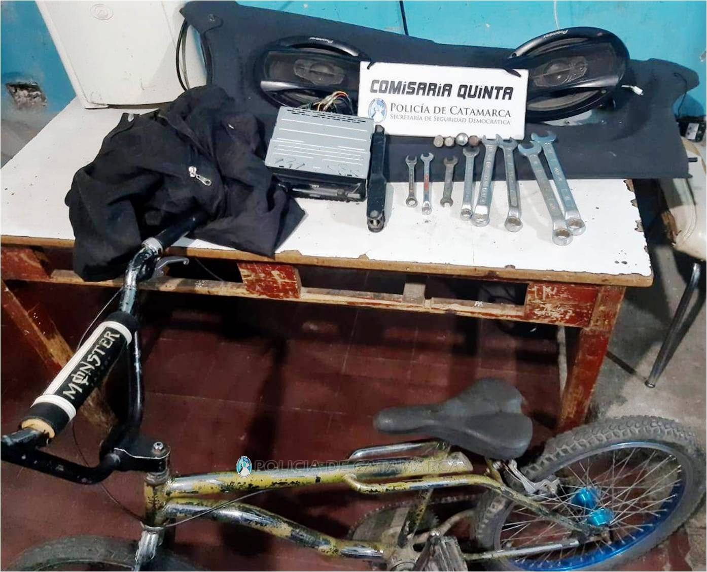 En el lugar, los policías se entrevistaron con un Cabo de Policía que estaba de franco de servicio, quien manifestó que mientras caminaba por la zona habría observado a un sujeto a bordo de una bicicleta tipo BMX, rodado 26, de color amarillo, y al percatarse de su presencia dejó abandonado el rodado, un estéreo Sony, ocho llaves combinadas, cuatro bulones de rueda, dos parlantes Triax marca Pioneer, un mango de fuerza, y una campera negra, que quedaron en calidad de secuestro, hasta determinar su legitima propiedad y procedencia.