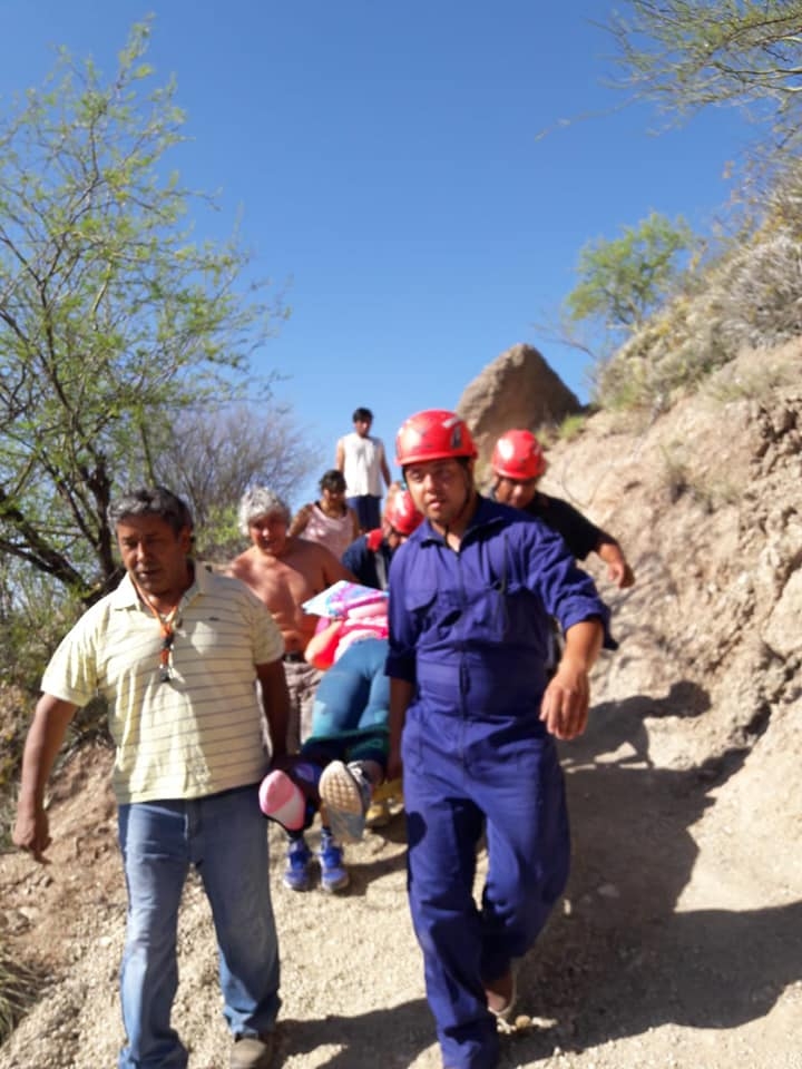 Por la lesión, la mujer no podía descender por sus propios medios y debió ser rescatada por el personal de Bomberos Voluntarios que se hizo presente en el lugar para realizar las maniobras de descenso.