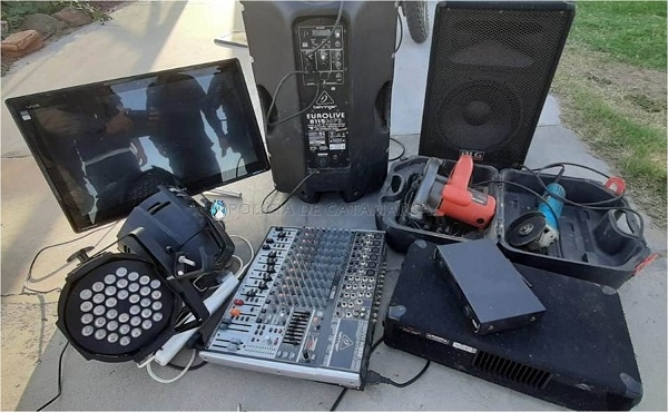 Al ver a los uniformados, el sujeto se dio a la fuga y dejó abandonados una consola de sonido, una potencia, una computadora Sonic, dos parlantes negros, cuatro prolongadores de corriente con sus respectivas zapatillas, cuatro reflectores Led, una amoladora Gama de color azul, una sierra circular Black Decker anaranjada con dos discos, un cable y un control remoto.