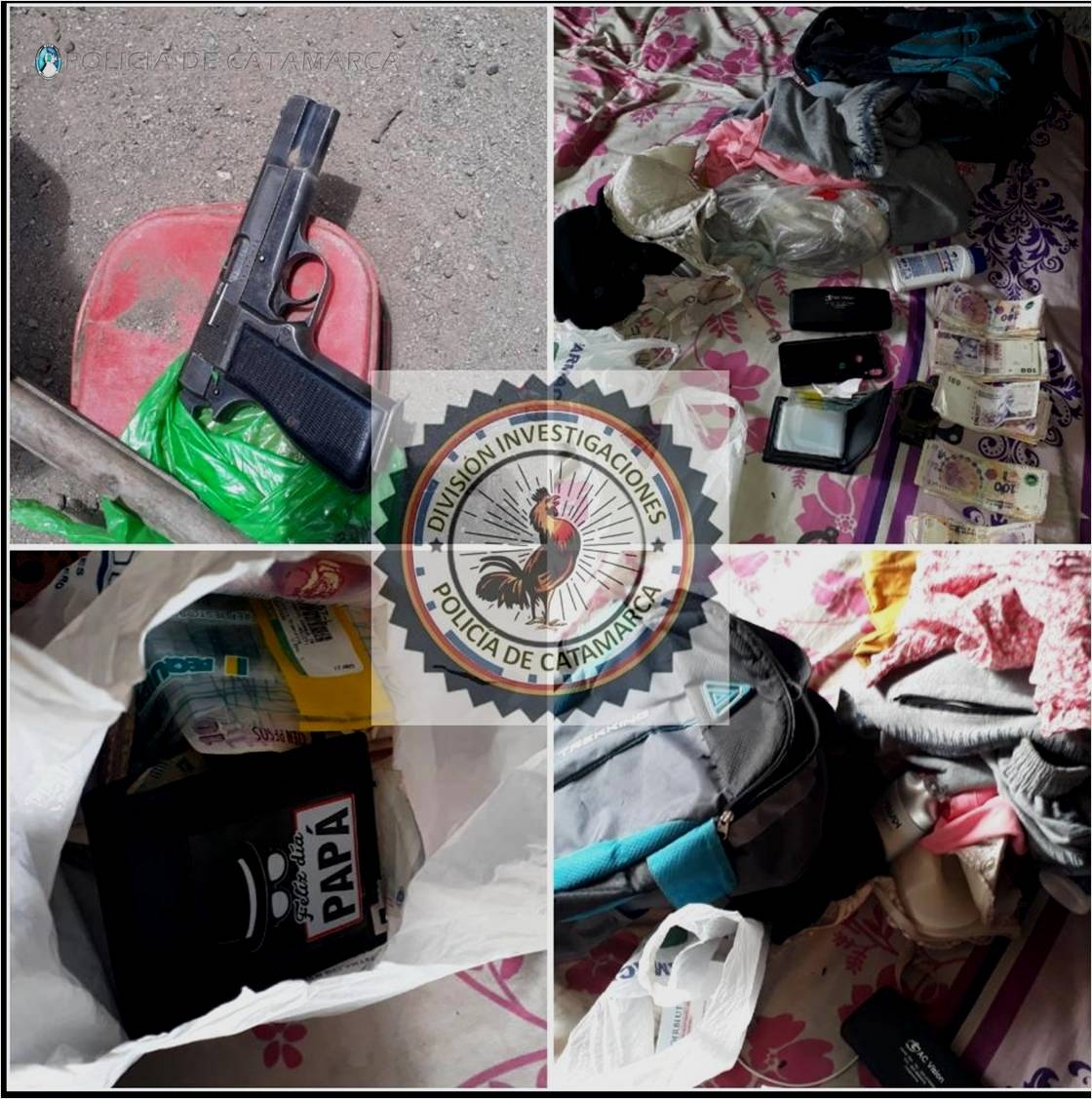 En el lugar, y bajo las directivas de la Fiscalía de Instrucción N° 9, a cargo de Dr. Jonathan Diego Felsztyna, los policías lograron recuperar un teléfono celular Samsung, una mochila con prendas de vestir varias, una billetera con documentación, la suma de 6020 pesos en efectivo y el arma de fuego que quedaron en calidad de secuestro.
