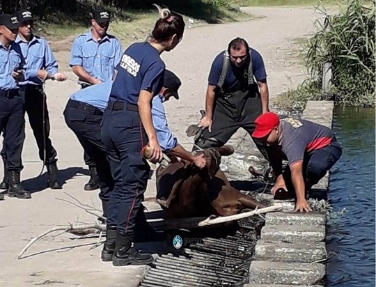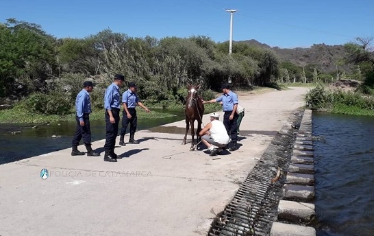En el lugar, los policías constataron que un equino habría quedado atrapado en las rejillas existentes en el lugar, por lo que de inmediato los policías, conjuntamente con Aspirantes a Agentes de la Escuela de Suboficiales y Agentes “Fray Mamerto Esquiú” y Bomberos Voluntarios de Valle Viejo, realizaron las tareas de rigor, y lograron rescatar el animal que fue entregado a su propietario.