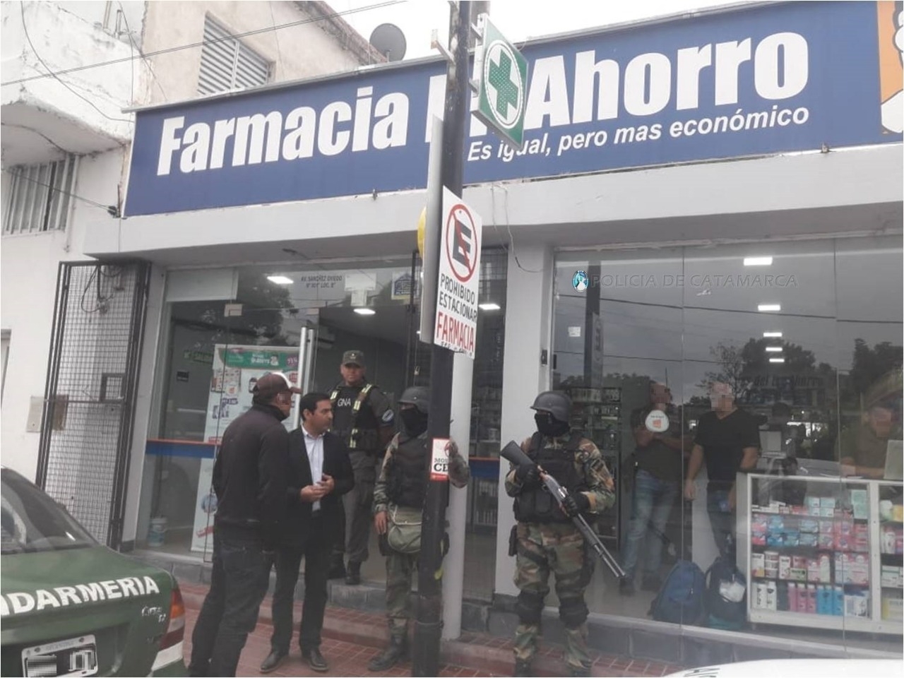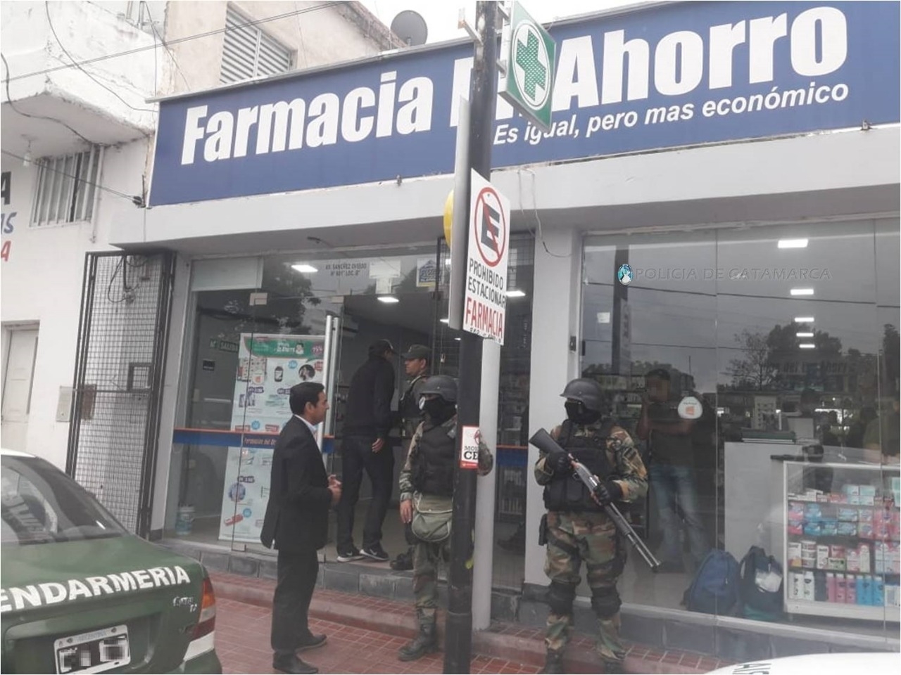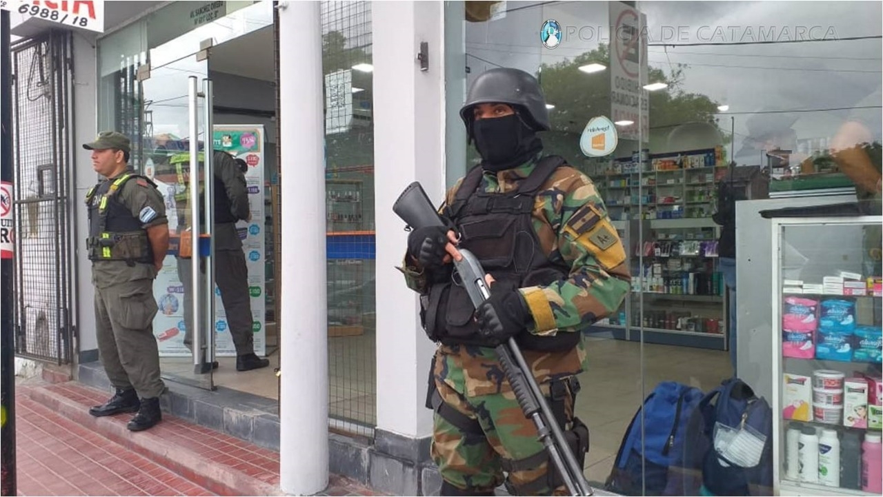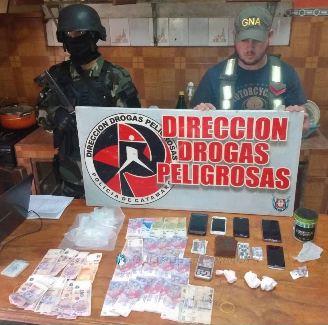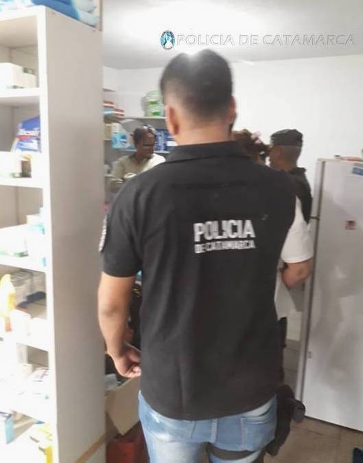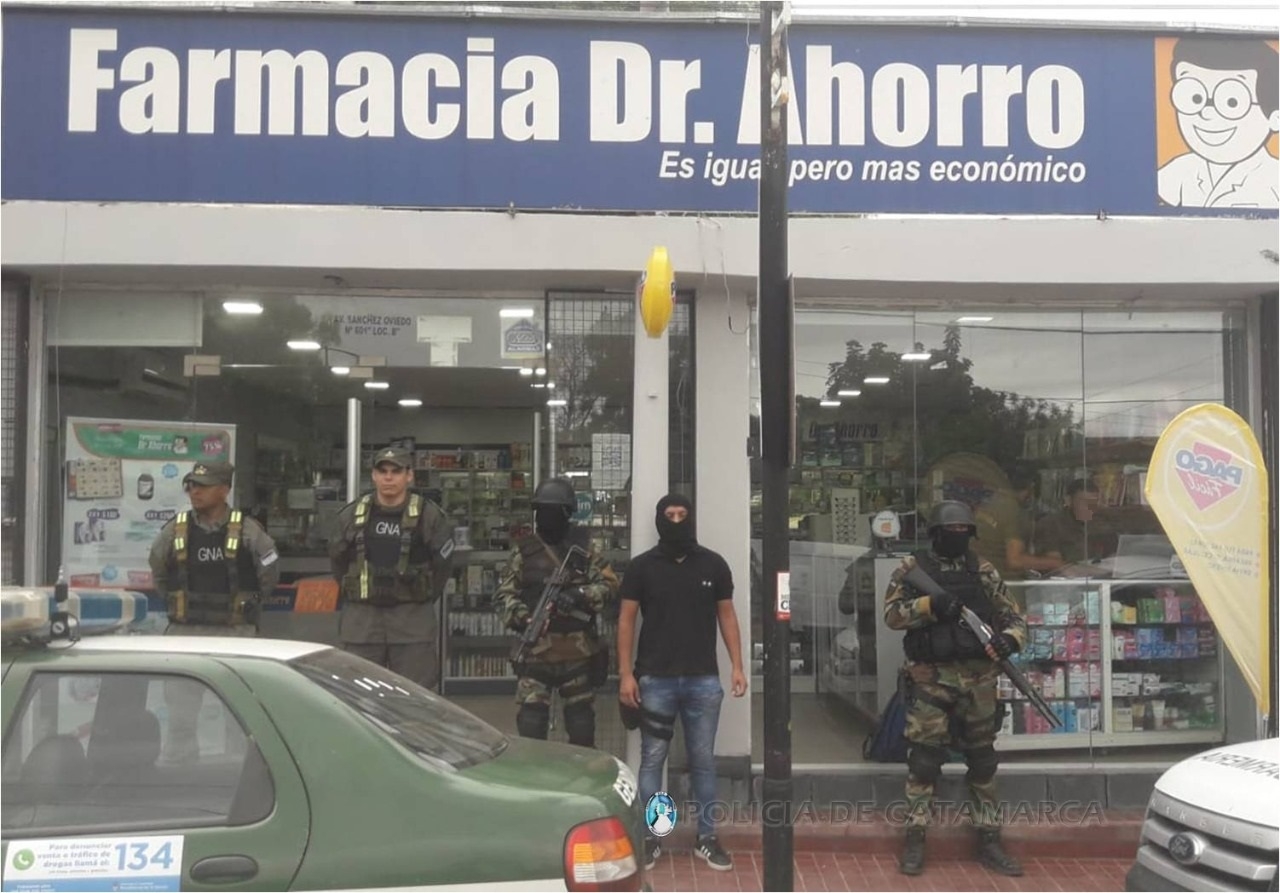 Tras irrumpir en una farmacia de la Avenida Güemes Oeste al 600, y en viviendas de la Peatonal N° 22 del Barrio Libertador II, de la calle N° 23 de Valle Chico, de la calle Caseros Norte al 500, de Avenida Los Inmigrantes al 100 y del Barrio 80 viviendas Sur, con la colaboración de personal de la División de Operaciones Especiales Kuntur, del Escuadrón Núcleo Catamarca y de las Comisarías Cuarta y Quinta, los efectivos secuestraron varias cajas de ansiolíticos y psicotrópicos, documentación de interés para la causa, boletas, recetas, libros contables, de balance de compra y venta y contralor de estupefacientes para Farmacias, 100 gr. de cocaína de máxima pureza, conocida como "alita de mosca", dos teléfonos celulares de distintas marcas y modelos, elementos para fraccionar estupefacientes, una balanza apta para pesar gramos, y una importante suma de dinero en efectivo, discriminada en billetes de distinta denominación.