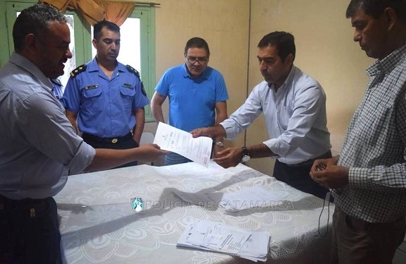 En la Subcomisaría de Banda de Varela, el Jefe de Policía Orlando Antonio Quevedo, junto al Jefe de la Unidad Regional N° 1, Mario Esteban Romero, al Jefe de la Comisaría Seccional Tercera, Jorge Adavid, y al Subcomisario Walter Espilocín, recibieron al Concejal Carlos Rubén Álvarez y al Ing. Mariano Sacaba, perteneciente a la Dirección de Catastro Municipal, con quienes mantuvieron una reunión e hicieron entrega de la Ordenanza mediante la cual el Concejo Deliberante de la Capital, decidió ceder en calidad de donación el terreno contiguo en donde actualmente funciona la Subcomisaría de Banda de Varela, en vistas a una futura ampliación de los espacios con los que cuenta esta dependencia policial.