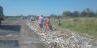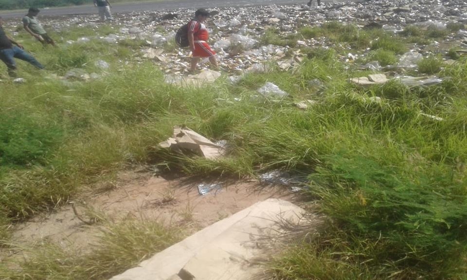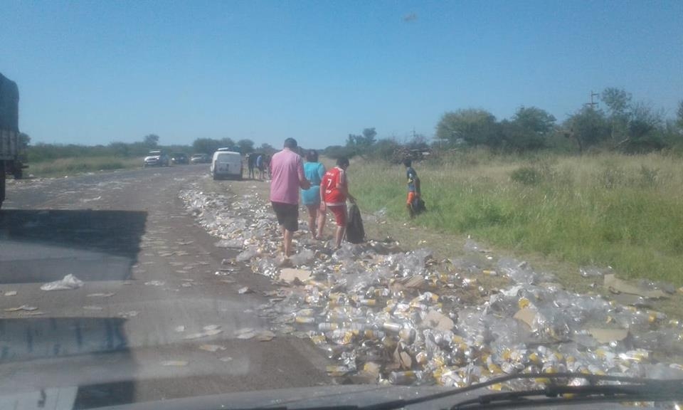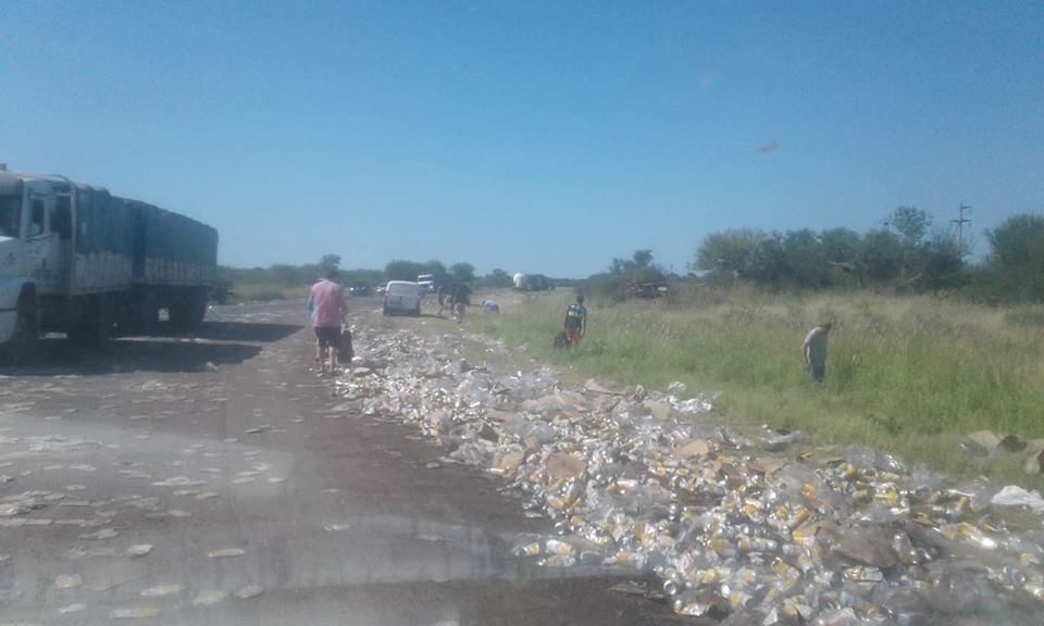 Con parte de la carga desparramada en la ruta y banquina, personas aprovecharon para apoderarse de latas qe quedaron en buen estado. Fotos: El Lapaceño.com
