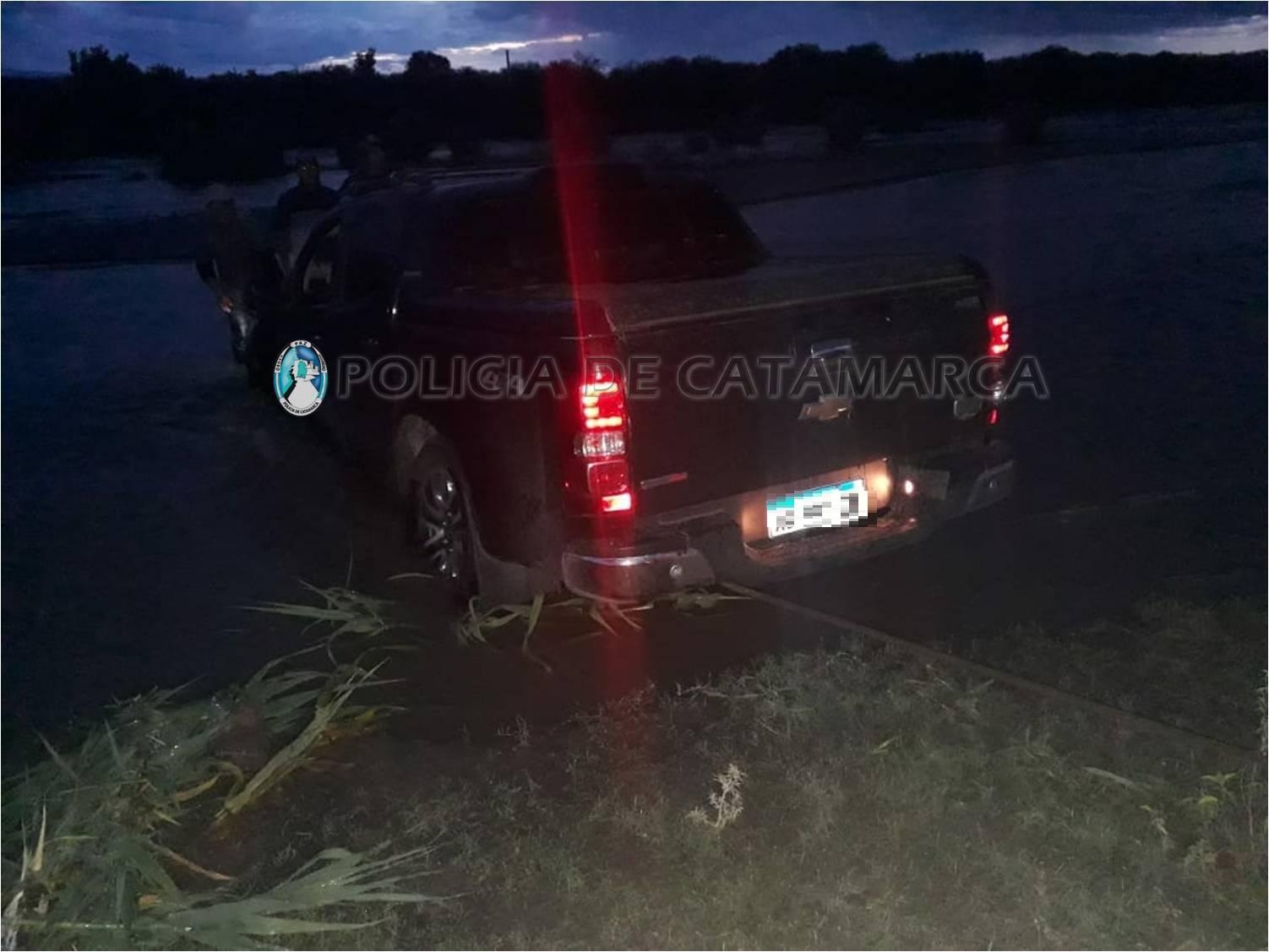 Anoche, a las 21, a través de un llamado telefónico, efectivos de la Dirección de Seguridad Vial de la Policía de la Provincia tomaron conocimiento que en el Río Santa Cruz, inmediaciones a la Villa del Portezuelo, departamento Valle Viejo, una camioneta Chevrolet S-10, de color negro, estaría varada en el cauce del río.