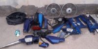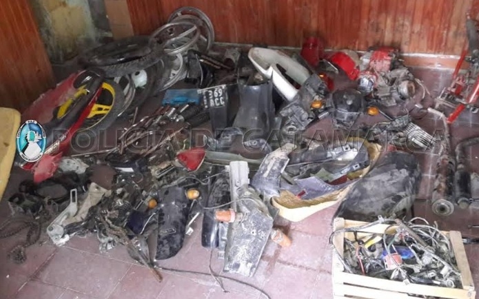 En el primer inmueble, el personal interviniente secuestró tres llantas traseras con su respectivo piñón, seis guardabarros interno traseros de color negro, un guardabarro delantero, ocho amortiguadores, cuatro brazos del apoya pies, dos palancas de freno delantero y trasero, tres resortes, una rosca, dos mango de goma, dos discos de freno, una pechera, un manubrio negro, dos cables de embrague, dos caños de escape, dos cubre cadena de color gris, dos manijas de agarre, dos palancas de cambio, tres trozos de cables, dos pata de apoyo lateral, dos motores completos, una cámara, una cubierta marca Pirelli, un cilindro completo sin pistón, un carburador, una tapa de freno con su respectivo cable, dos faros delanteros y traseros con sus guiños, dos filtros de aire, una palanca de freno trasero, un par de manijas de porte trasero, un trozo de cadena.