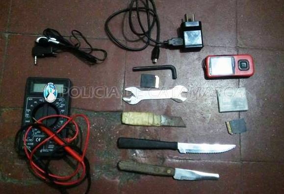Al momento de realizarle la requisa correspondiente, los efectivos encontraron entre sus prendas de vestir un cargador, una batería para celular, un par de articulares para teléfono celular, un multímetro digital, un MP-4, un cuchillo tipo tramontina, dos tarjetas de memoria, dos elementos punzantes de fabricación casera y herramientas varias.