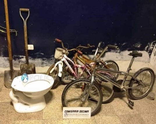 Hoy, a las 00:40 en un sitio baldío existente en inmediaciones a la cancha del Club Liberal, policías secuestraron 1 bicicleta rodado 10, marca Aurorita, de colores morado y blanco; 1 bicicleta cromada rodado 16; 1 bicicleta rodado 10 Ciclopal, de color marrón; 1 pala de punta cabo largo; 1 pala ancha cabo corto, y 1 inodoro de color blanco.