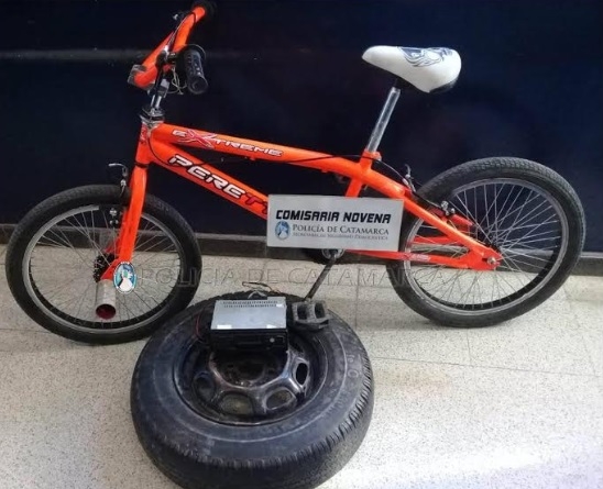 Se trataba de una rueda de auxilio de automóvil, una bicicleta rodado 20, de color anaranjado, y un estéreo marca Philco negro.