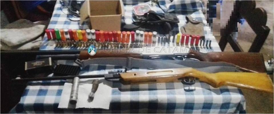 Luego de irrumpir en dos viviendas ubicadas en la localidad de Alijilán, Dpto. Santa Rosa, propiedad de las familias Morales y Toloti, conjuntamente con personal de la Subcomisaría de Alijilán, los efectivos secuestraron una escopeta doble caño calibre 16, una escopeta marca Huglu 601 G, calibre 12 mm., un rifle aire comprimido calibre 5,5 mm., dos pistoleras, una munición para entrenamiento de guerra con mortero Subcalibre 25 mm., dos cartuchos de FAL calibre 7,62 mm., 25 cartuchos calibre 32 mm. largo, 6 cartuchos 9 mm., tres cartuchos 44 mm., cuatro cartuchos 38 mm., 25 cartuchos calibre 12 mm., y 5 cartuchos calibre 16 mm., en virtud que los moradores carecían de la documentación correspondiente, como así también dinero en efectivo discriminado en billetes de distinta denominación, y gran cantidad de semillas de la variedad Cannabis Sativa.