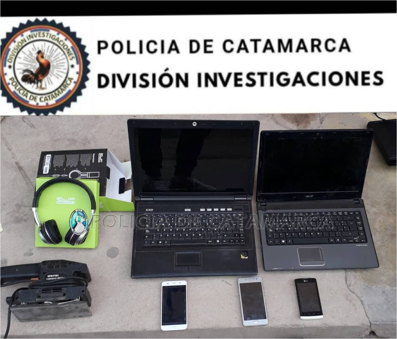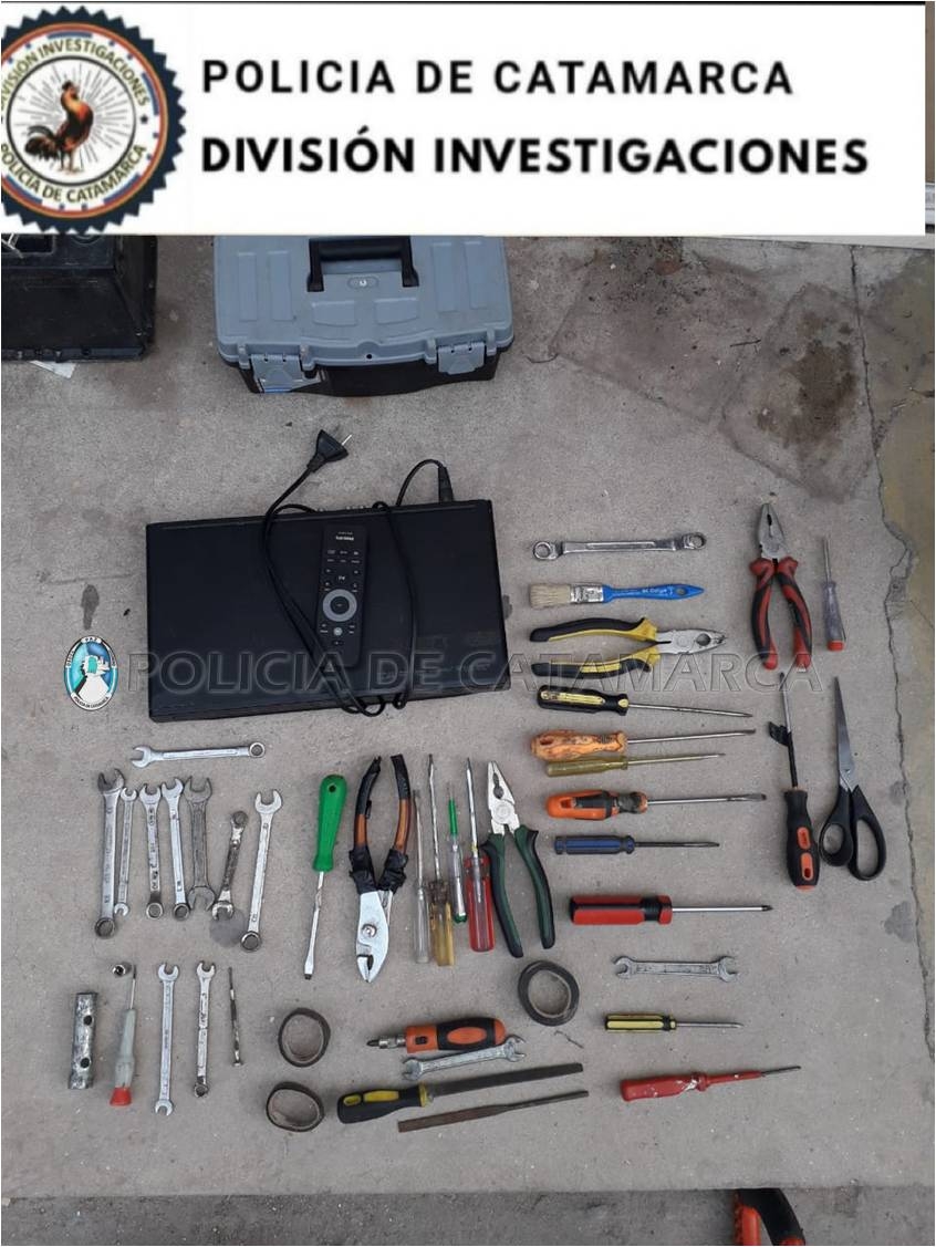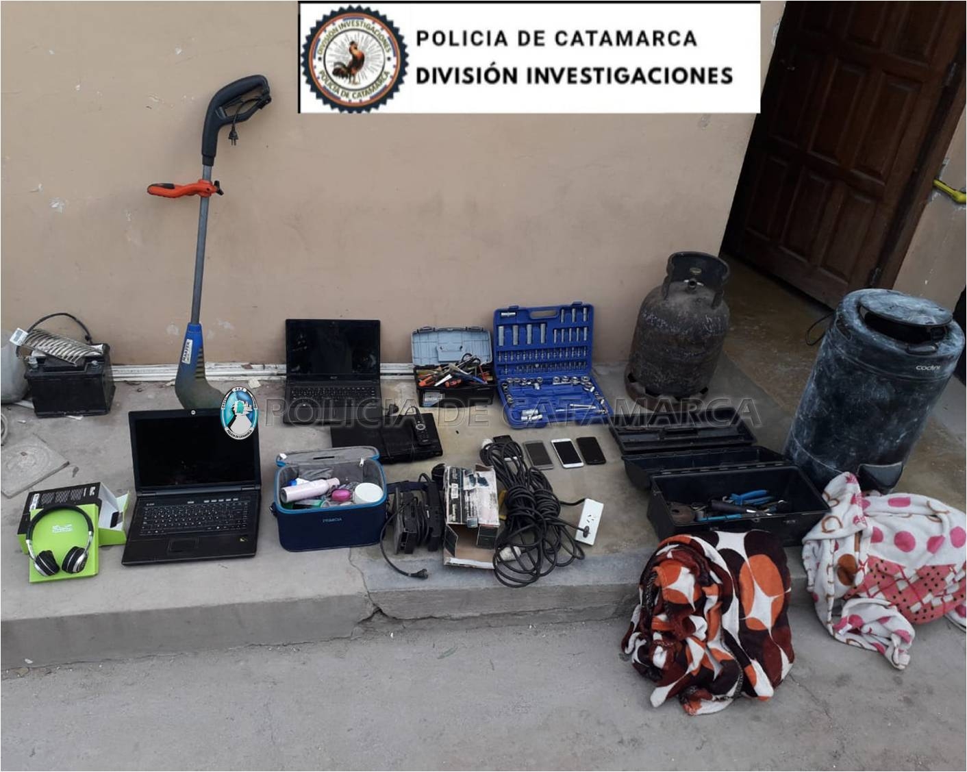 En el inmueble y bajo las directivas de la Fiscalía de Instrucción N° 2, a cargo del Dr. Mauricio Navarro Foressi, los investigadores lograron recuperar una garrafa de gas de 10 kg., un reproductor de DVD Philips, y un secarropa, que quedaron en calidad de secuestro al igual que cuatro teléfonos celulares de distintas marcas y modelos, dos computadoras portátiles, dos cajas con herramientas varias, una caja con tubos de distintas medidas, una bordeadora de césped, dos prolongadores de corriente, una máquina lijadora, un headphone, y un bolso que contenía productos de belleza, de los cuales los moradores no supieron acreditar la legítima propiedad y procedencia.