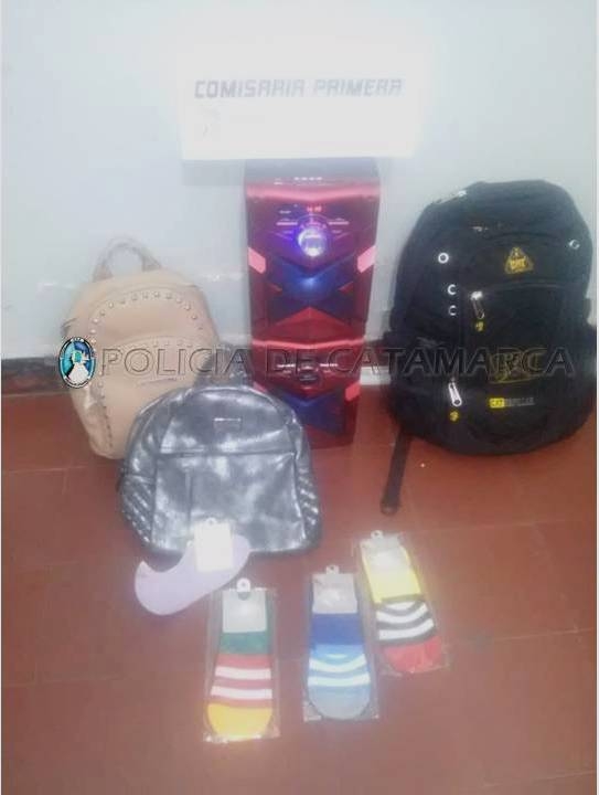 De inmediato, los policías realizaron un amplio recorrido por la zona y en la calle Salta al 800 aprehendieron a un joven de 21 años, de apellido Amaya, oriundo de la provincia de Tucumán, quien habría sido sorprendido llevando a pie un bolso de color marrón, marca Good Compañy, una cartera gris Squash, una mochila negra, cuatro pares de calzas marca Qiling, un par de soquetes, un parlante musical Hifi Karaoke, de colores negro y bordó, y una tarjeta de memoria, que serían producto del hecho investigado, en virtud de lo cual quedaron en calidad de secuestro.