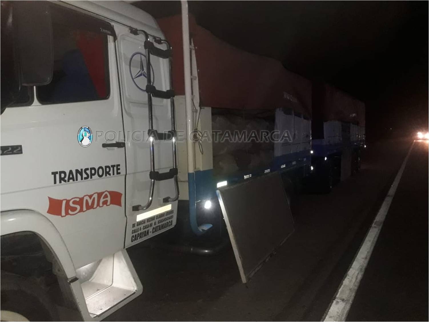 Fue entre la localidad de Palo Labrado, Paclín y el puesto caminero El Portezuelo ubicado en la ruta nacional N°38, Valle Viejo, donde procedieron a controlar un camión Mercedes Benz, de color blanco, conducido por un hombre de apellido Vizzoni, de 42 años.
