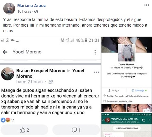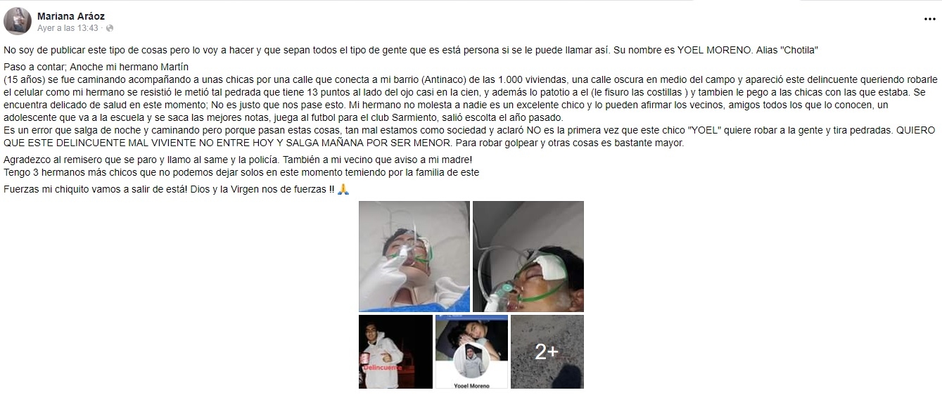 Paso a contar; Anoche mi hermano Martín (15 años) se fue caminando acompañando a unas chicas por una calle que conecta a mi barrio (Antinaco) de las 1000 viviendas, una calle oscura en medio del campo y apareció este delincuente queriendo robarle el celular como mi hermano se resistió le metió tal pedrada que tiene 13 puntos al lado del ojo casi en la cien, y además lo patotio a el (le fisuro las costillas ) y también le pego a las chicas con las que estaba. Se encuentra delicado de salud en este momento; No es justo que nos pase esto. Mi hermano no molesta a nadie es un excelente chico y lo pueden afirmar los vecinos, amigos todos los que lo conocen, un adolescente que va a la escuela y se saca las mejores notas, juega al futbol para el club Sarmiento, salió escolta el año pasado.