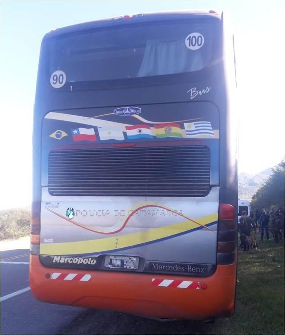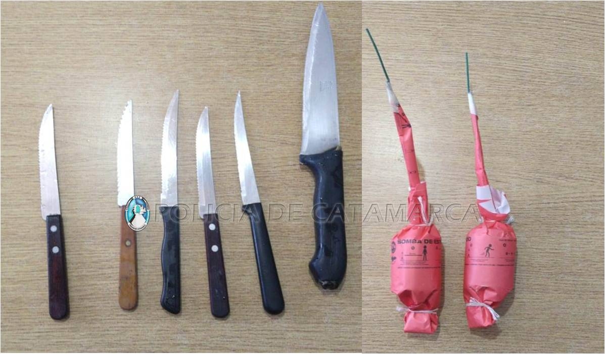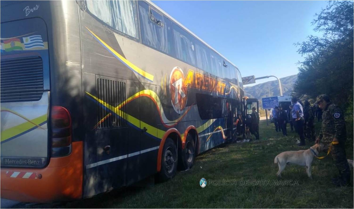 Durante la requisa correspondiente, con la ayuda de canes adiestrados para detectar estupefacientes, entre las pertenencias de tres de ellos y oculto en distintas partes del habitáculo de los micros, los efectivos encontraron varios envoltorios de nylon que contenían una sustancia tipo herbácea, que al ser sometida a la prueba de campo correspondiente por parte de personal de la Dirección Drogas Peligrosas, se logró establecer que se tratarían de 56 dosis de marihuana, que quedaron en calidad de secuestro a disposición del Juzgado Federal, como así también cinco cuchillos tipo tramontina, una cuchilla de cocina y dos bombas de estruendo, que también fueron incautados.