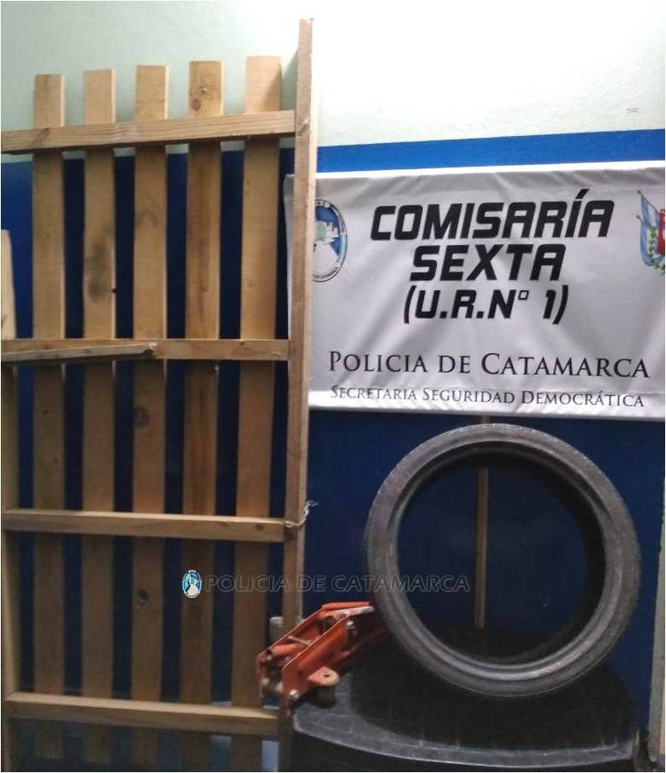 Al llegar al lugar, los policías procedieron al secuestro de un neumático para auto, marca Westlake, rodado Nº 17, un gato hidráulico rojo y una parrilla para cama de una plaza, que estaban abandonados en el lugar.