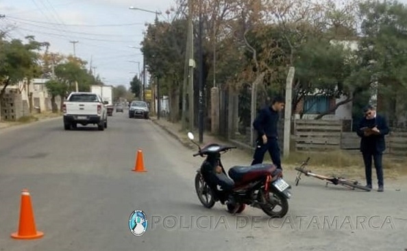 A las 17 de hoy, en la esquina de las calles Padre Esquiú y Los Brachos de la localidad de San Isidro, Valle Viejo, se produjo un siniestro vial protagonizado por una motocicleta Corven Mirage 110 cc., de color negro, en la que circulaban dos adolescentes de 17 años, que por razones que se tratan de establecer cayeron a la cinta asfáltica.