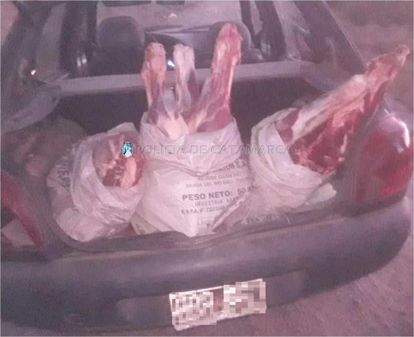 Al inspeccionar el rodado, los policías encontraron en el baúl unos 100 kg. de carne vacuna y alrededor de 8 Kg. de carne porcina que eran transportados sin la cadena de frío y medidas de salubridad e higiene correspondientes.