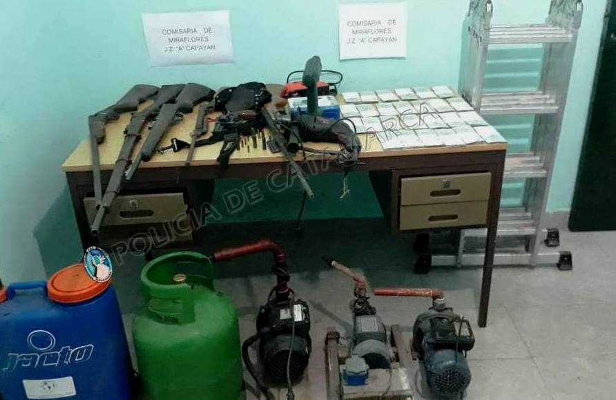 Tras irrumpir en la vivienda, bajo las directivas del Juzgado de Control de Garantías N° 3, a cargo del Dr. Ramón Porfirio Acuña, los policías incautaron tres bombas de agua, marcas Gamma y Volcang, una garrafa de gas verde de 10 Kg., un taladro negro marca Skil, la suma de 2500 pesos, una sierra caladora marca Black and Deker, de color anaranjado, un taladro inalámbrico verde, marca Bosch, con su respectivo estuche, un prolongador de corriente, una pistolera con cinto de galón negro, un revólver Cal. 32 mm., marca pucará, dos rifles de aire comprimido, una caravina Cal. 22 mm., modelo 62 juvenil Diana, una escopeta cal. 16 mm., marca Centauro modelo 30, un rifle de abancarga, un cargador con seis cartuchos, un cinturón de tela con ocho cartuchos calibre 32 mm., y una mochila fumigadora, marca Jacto, de colores azul y anaranjado, con sus respectivos accesorios.