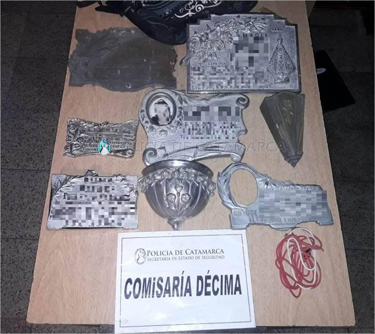 En el lugar, procedieron a la aprehensión de dos jóvenes de 23 y 29 años, ambos de apellido Ríos, quienes habrían sido sorprendidos circulando a pie por el lugar, llevando una mochila negra que en su interior contenía seis placas de bronce y otros elementos que habrían sido sustraídos de los nichos del Cementerio Municipal de la Capital, que quedaron en calidad de secuestro.