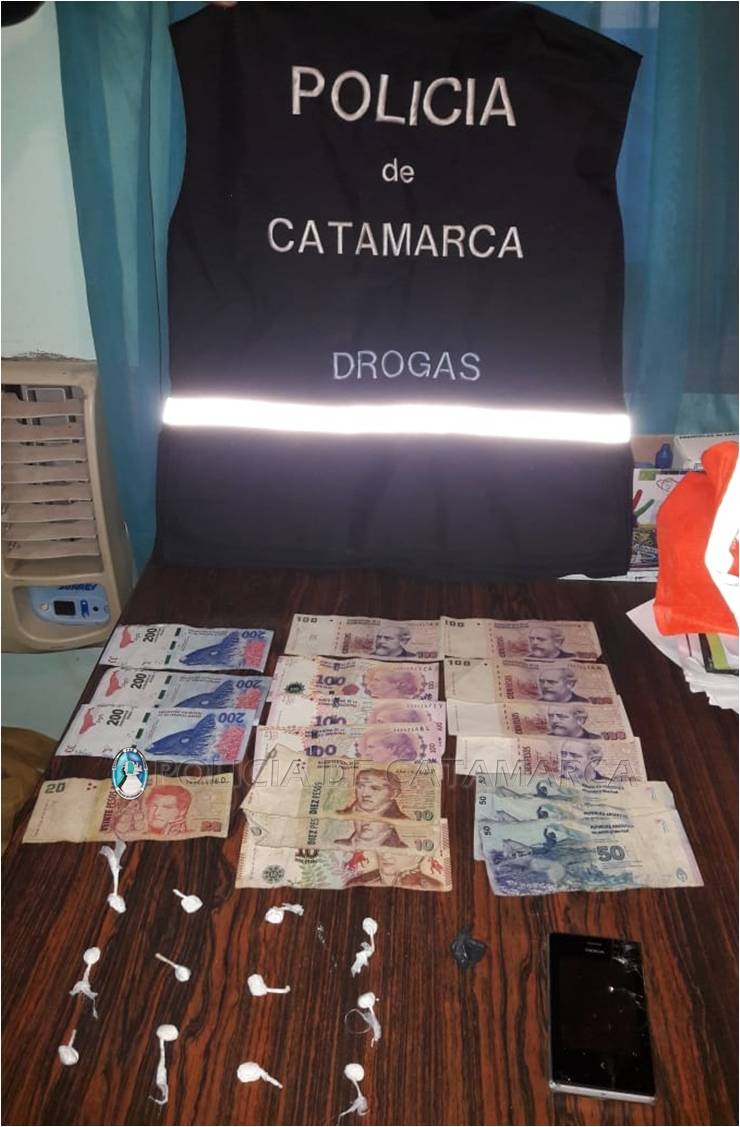 Al momento de realizarle la requisa correspondiente, los policías encontraron entre sus prendas de vestir 12 envoltorios de nylon que en su interior contenían una sustancias de color blanco, y otro envoltorio con una sustancia tipo herbácea, como así también la suma de 1600 pesos en efectivo, y un teléfono celular marca Nokia, de colores blanco y negro.