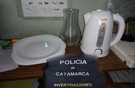 De inmediato y bajo las directivas de la Fiscalía de Instrucción en turno, los uniformados materializaron un registro domiciliario en una vivienda ubicada en la Manzana “A” de barrio Mi Jardín, propiedad de la familia Roldán Bazán, donde los investigadores lograron recuperar una jarra de vidrio, seis platos blancos de porcelana y una Pava eléctrica marca Moddo.