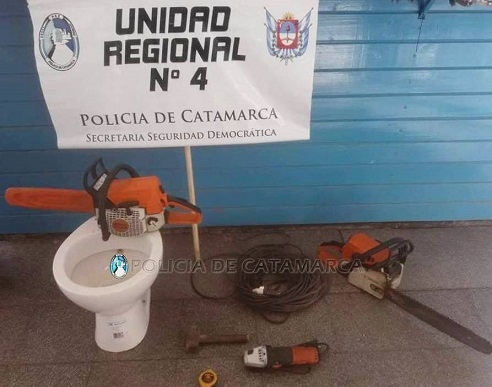 Por otro lado, conforme otra denuncia penal radicada por el Delegado Comunal, quien manifestó que personas desconocidas habrían sustraído un inodoro del Cementerio Municipal, los efectivos cumplimentaron un allanamiento en un inmueble de la Avenida Argentina, propiedad de la familia Sacheti, donde incautaron el sanitario sustraído, al igual que una motosierra de la cual el morador no supo acreditar la legítima propiedad y procedencia.