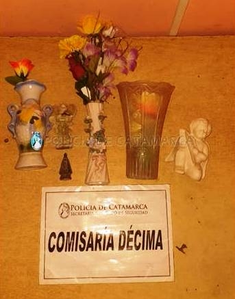 Ayer, a las 19, efectivos de la Comisaría Décima se hicieron presentes en el Cementerio Municipal donde aprehendieron a un joven de apellido Contreras (20) quien fue sorprendido sustrayendo varios floreros e imágenes religiosas de la necrópolis.