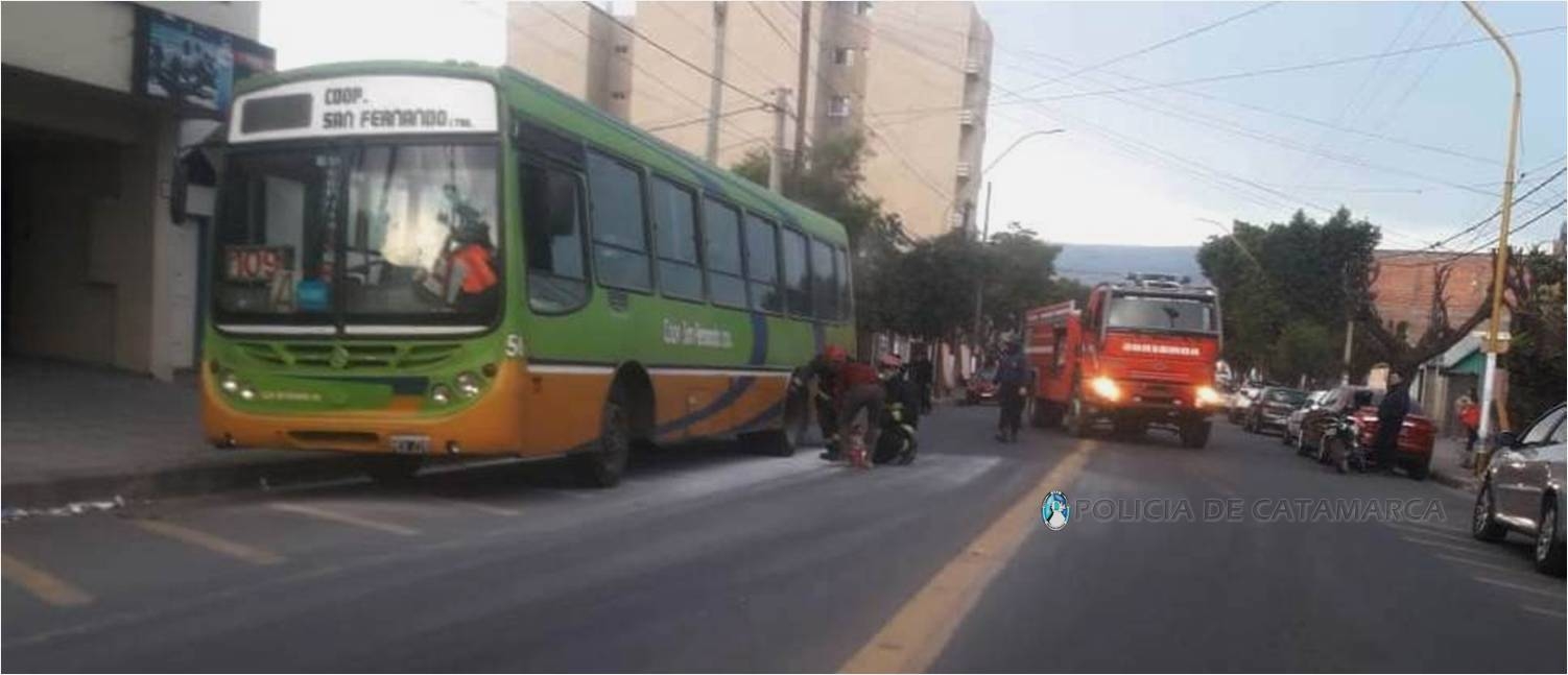En el lugar, se estaba produciendo un principio de incendio en un colectivo Mercedes Benz, dominio HEV-218, de color amarillo, perteneciente a la Cooperadora San Fernando, al mando de un joven de apellido Gutiérrez, de 23 años.