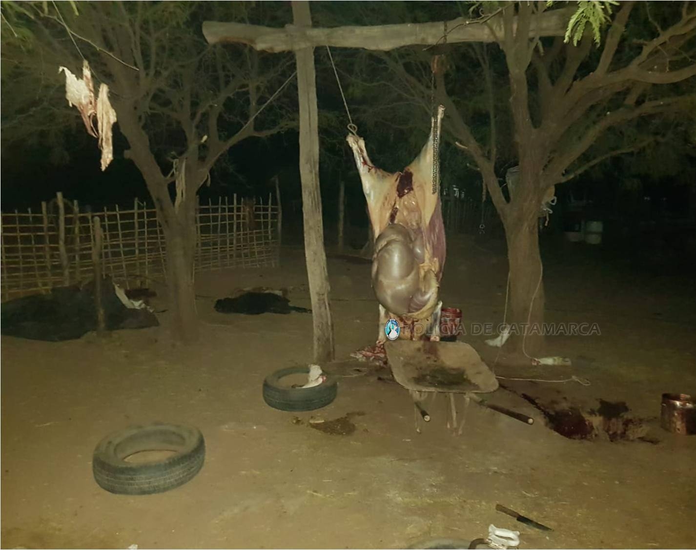 En un domicilio del barrio San Lorenzo, de la localidad mencionada, el personal policial interviniente procedió a la aprehensión de un hombre de apellido Fernández, de 45 años, y al secuestro de un animal vacuno de unos 120 Kg. aproximadamente que estaba siendo faenado, varios cuchillos y una sierra manual.