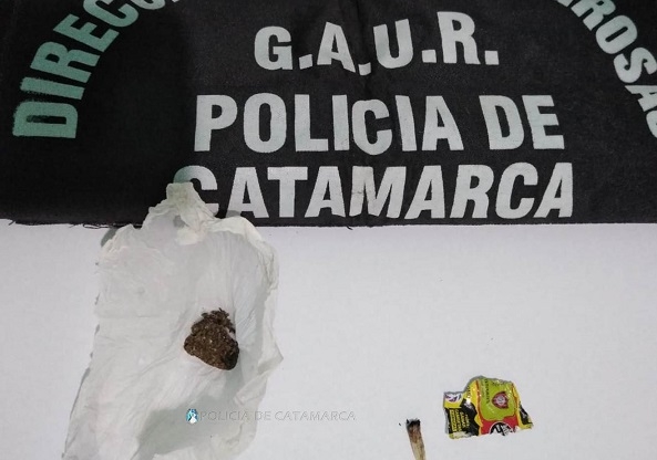 Asimismo, a las 16:30, en el Puesto Caminero La Puerta, ubicado en la ruta provincial N° 1, personal de las Direcciones de Seguridad Vial y Drogas Peligrosas de la Policía de la Provincia controló un automóvil Fiat 147 beige, en el que circulaban cinco personas del sexo masculino, mayores de edad, y con la ayuda del can Black, entrenado para detectar estupefacientes, los efectivos encontraron en el baúl del rodado un cigarrillo de armado casero y un trozo compactado conteniendo 3 Gr. de Marihuana, que también fueron incautados al igual que una pipa de fabricación casera.