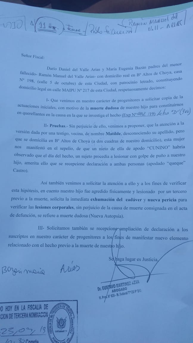 El abogado confirma que se pidió la exhumación del cuerpo para una nueva autopsia. “La autopsia que me presentaron no descarta de que existan lesiones que son compatibles a lesiones previas a la muerte, no solo muerte por aplastamiento y asfixia”, apuntó.