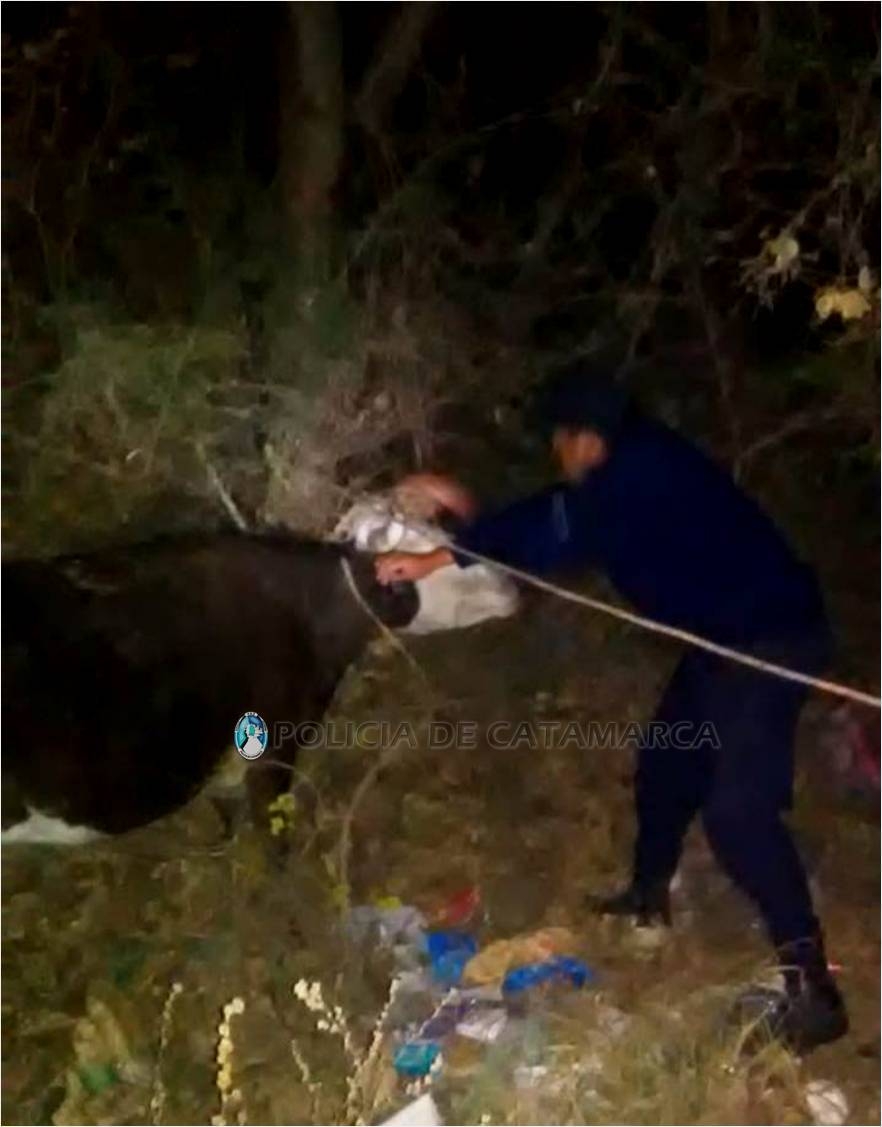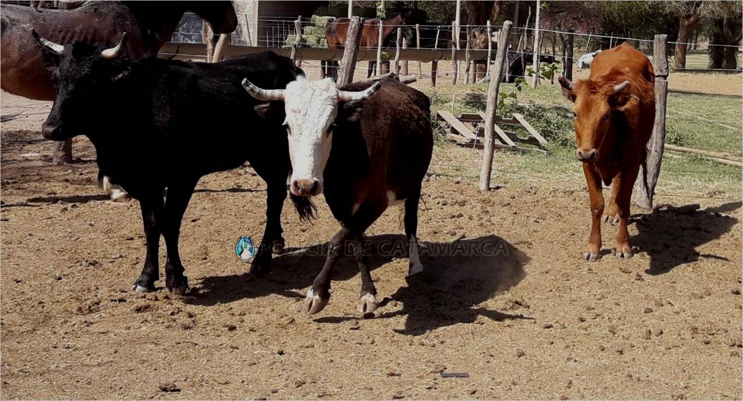 A la altura de esa localidad del departamento Valle Viejo, procedió al secuestro de una tambera astuda, pelaje colorado, señal de sangre en oreja derecha despunte y muesca de arriba, y en oreja izquierda media lanza de arriba y muesca de abajo, con una lesión en la punta del asta derecha, sin marca de fuego, y de otra tambera astuda negra, señal de sangre en oreja derecha despunte y muesca de encima, y en oreja izquierda despunte y muesca de abajo, sin marca de fuego.