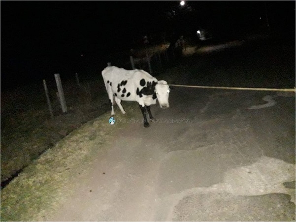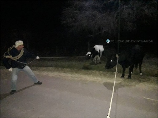 Por último, en la ruta provincial N° 16, a la altura del complejo habitacional Los Alpinos Banda Sud de la localidad de La Puerta, Ambato, los Policías procedieron al secuestro de una vaca mocha overa, señal de sangre en la oreja izquierda hoja de higuera, y en oreja derecha pilón con caravana N° DP041A0046, marca de fuego no visible; una vaca mocha negra, con señal de sangre en la oreja izquierda banco de abajo y hoja de higuera, y en la oreja derecha despunte y zarcillo de abajo, con caravana N° DP041A0291, marca de fuego no visible y una vaca mocha, pelaje overo, señal de sangre en la oreja izquierda despunte y zarcillo de abajo y en la oreja derecha sacado de arriba.
