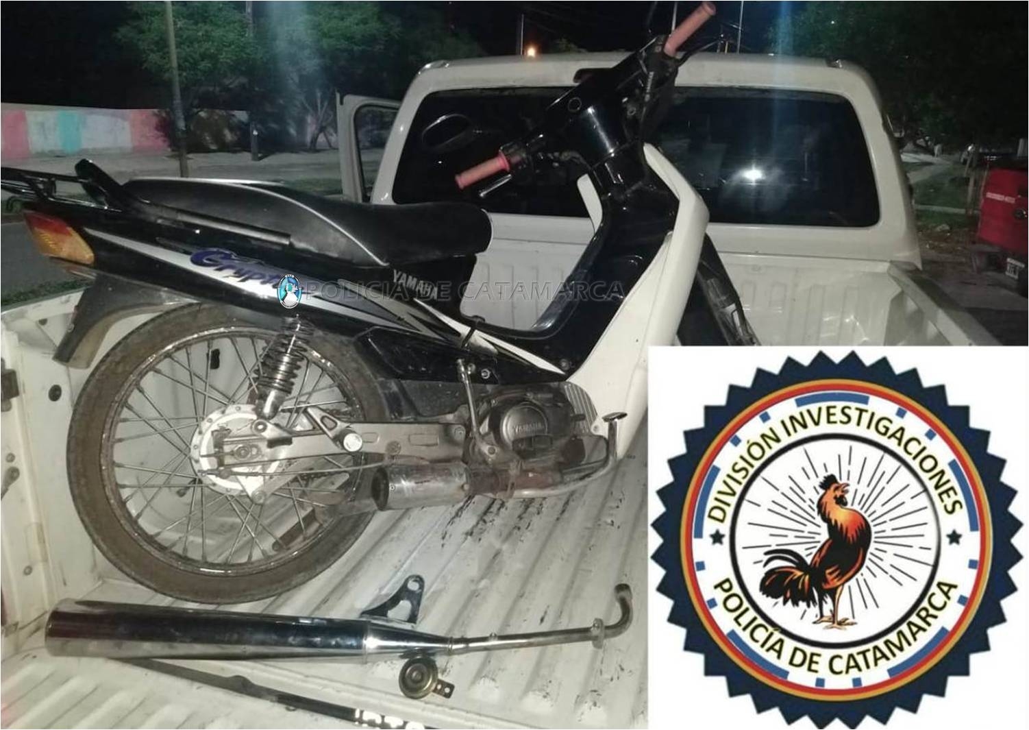 Luego de realizar tareas de su especialidad, los investigadores llegaron hasta la ruta provincial N° 1, inmediaciones al Kartódromo de Payahuaico, de la localidad de San José de Piedra Blanca, departamento Fray Mamerto Esquiú, y procedieron a la aprehensión de una joven mujer de apellido Perea (21), y recuperaron un caño de escape y una bocina, que serían de la motocicleta sustraída, como así también incautaron una Yamaha Crypton 110 cc., de colores negro y blanco, de la cual no supo acreditar su legítima propiedad y procedencia.