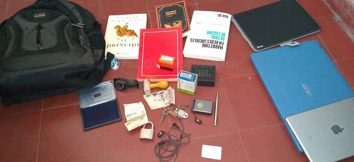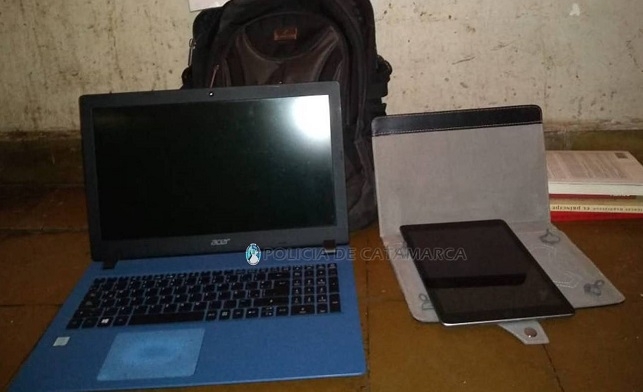 En el lugar, el personal policial interviniente procedió a la aprehensión de un joven y de un hombre de 22 y 33 años, ambos de apellidos Mercado, y durante la requisa correspondiente, los Policías encontraron una mochila de color negro, la cual contenía una Notebook azul, una tablet, un juego de llaves, un auricular, cuatro libros, un reloj negro, un candado, una almohadilla, varios sellos aclaratorios, dinero en efectivo, y documentación varia, que quedaron en calidad de secuestro.