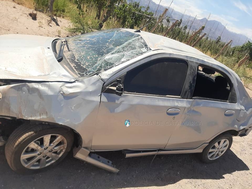 A las 11:50 de la mañana de ayer, se registró un siniestro vial en una calle Sin Nombre del barrio Juan Manuel Salas de la localidad de Fiambalá, Departamento Tinogasta, protagonizado por un automóvil Toyota Etios gris, en el que circulaba Erick Jairo Ezequiel Sinchez (26), quien por causas que son materia de investigación perdió el control del rodado y volcó a un costado de la calzada.