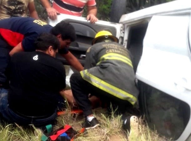 En el trayecto hacia dicha asistencia, y casi a 3 kilómetros del ingreso a la Cuesta de El Portezuelo, los bomberos advirtieron un auto que acababa de protagonizar un vuelco a metros de la ruta. Se trataba de un Fiat Siena, patente AA226GG, en el que se trasladaban Tomas Alberto Canisa de 25 años y Noelia del Carmen Gordillo de 28 años, ambos de la localidad de Huaycama.