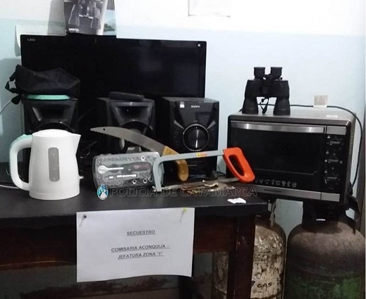 En inmuebles ubicados en el Paraje Alto de Las Juntas de la localidad mencionada, propiedad de las familias Lara, Lucero y Gutiérrez, los Policías lograron recuperar dos garrafas de gas grises, de 15 Kg. cada una; un horno eléctrico; una pava eléctrica blanca; un par de binoculares; una sierra; un cuchillo serrucho; un equipo de música marca SONY; una caja de criquet y un televisor LCD Sanyo negro, de 32” pulgadas, que quedaron en calidad de secuestro.