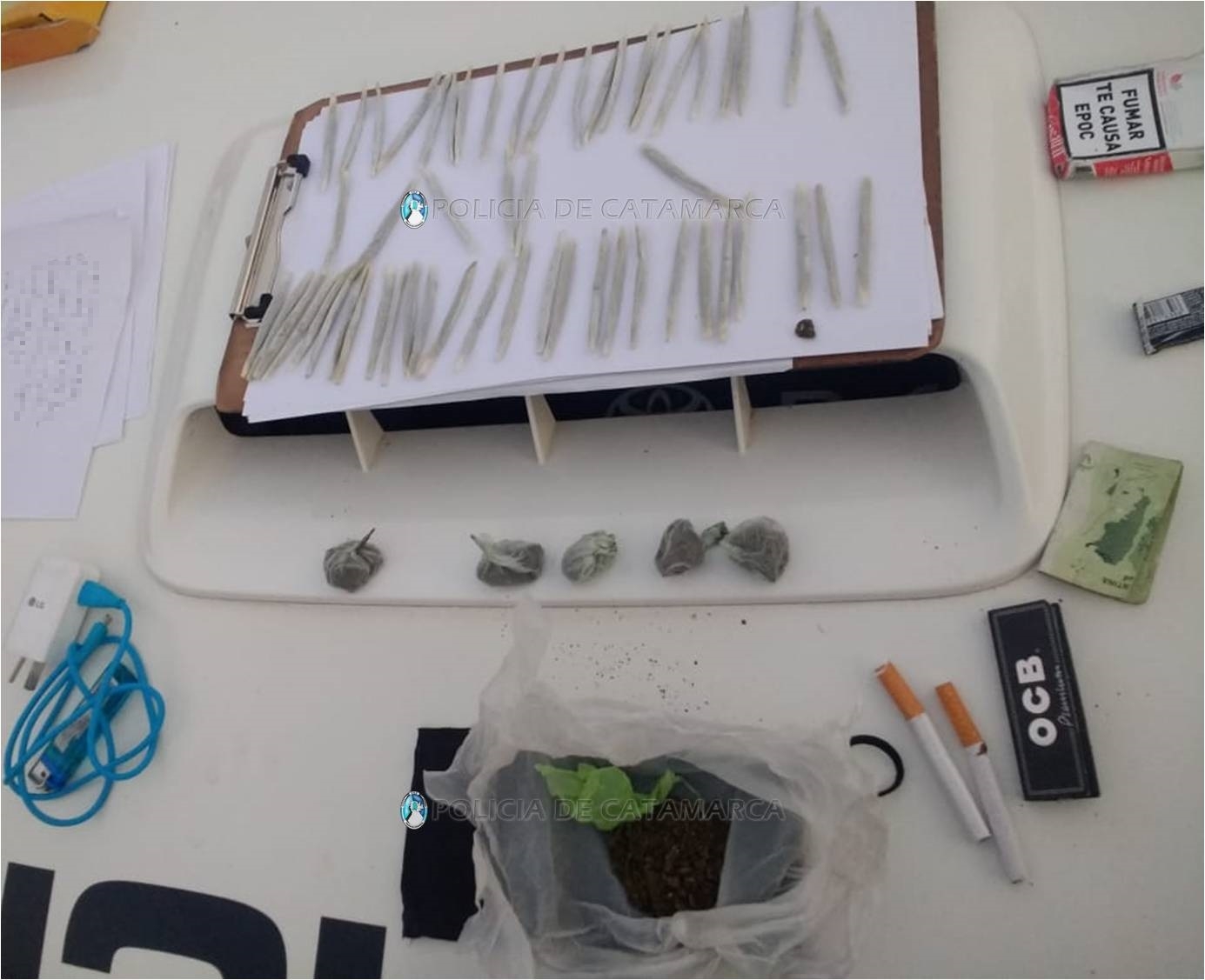 Al momento de ser identificadas, los policías encontraron entre sus prendas de vestir 54 cigarrillos de armado casero y seis envoltorios de plástico conteniendo una sustancia herbácea que, al ser sometidos a la prueba de campo correspondiente, arrojó como resultado que se tratarían de 31 gr. de marihuana, que quedaron en calidad de secuestro al igual que un teléfono celular Samsung, de color negro, y una bolsa de tela negra, a disposición del Juzgado Federal.