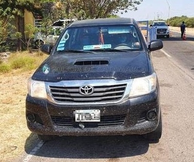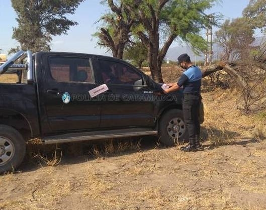 Allí procedieron al secuestro de una camioneta Toyota Hilux negra, en la que circulaban un joven de 25 años y un hombre de 32 años, ambos provenientes de la Provincia de La Rioja, quienes carecían del seguro obligatorio y la revisión técnica obligatoria (RTO).